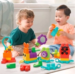 De set bevat 30 grote bouwstenen, waaronder enkele speciale onderdelen die zijn ontworpen om kinderen van 1 tot 3 jaar te stimuleren. Bevat acht sensorische functies ter ontwikkeling van tast-, zicht- en gehoorwaarneming. De blokken zijn compatibel met alle Mega Bloks-speelgoed, wat de speelmogelijkheden verder uitbreidt.