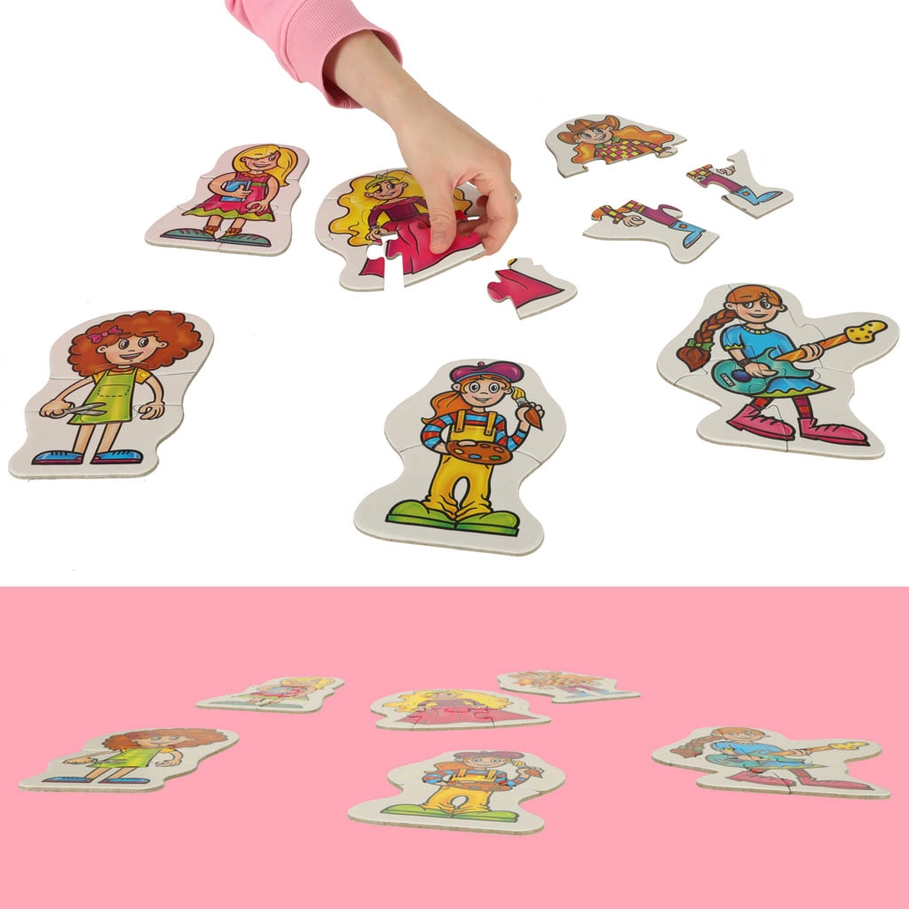 De set bevat in totaal 27 stukjes, verdeeld over 6 afbeeldingen met een meisjesachtig thema. Dankzij de dikte van 3 mm liggen de stukjes goed in kleine handjes en passen ze stevig in elkaar. Geweldig als cadeau en als activiteit om samen met ouders te doen.