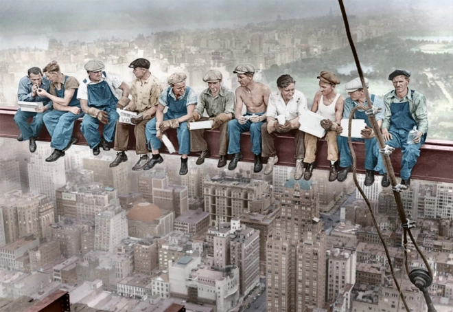 De beroemde scène van arbeiders op een stalen ligger brengt de authentieke sfeer van het wolkenkrabbertijdperk.