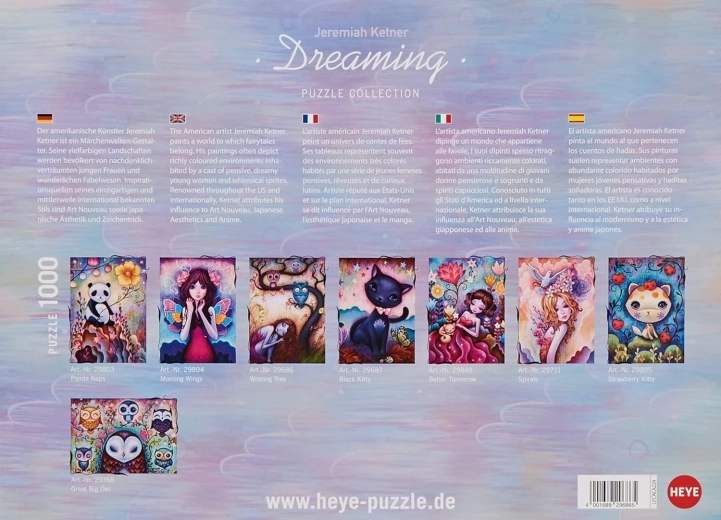 Ontdek de betoverende wereld van kunstenaar Jeremiah Ketner met de HEYE Dreaming – Wensboom puzzel van 1000 stukjes. Geniet van hoogwaardige druk, precieze stans en een betoverende illustratie geïnspireerd door art nouveau, Japanse esthetiek en anime-stijl. Ideaal om te ontspannen of als stijlvol cadeau.