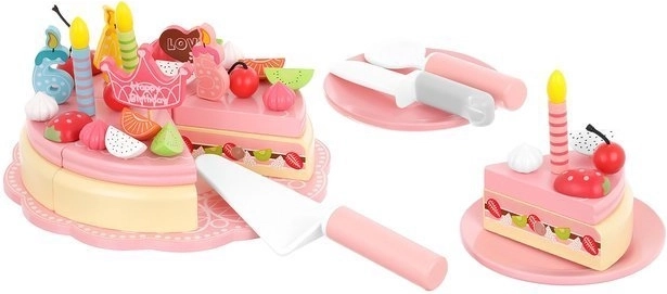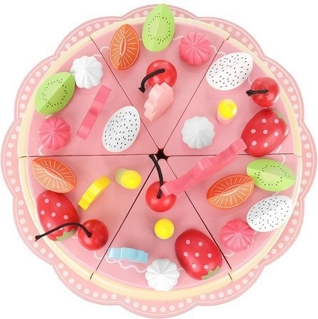 Deze taart is gemaakt van hoogwaardig hout dat veilig is voor kinderen en biedt tijdloze schoonheid en duurzaamheid. De taartstukken zijn verbonden door magneten, zodat kinderen de taart "kunnen snijden" en serveren op de bijgevoegde bordjes met hulp van het bestek.