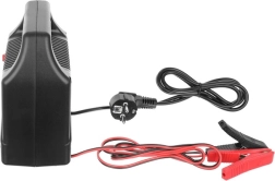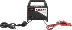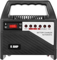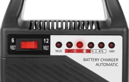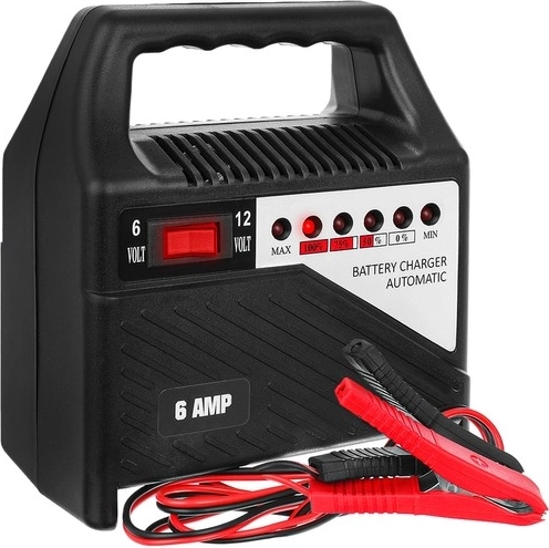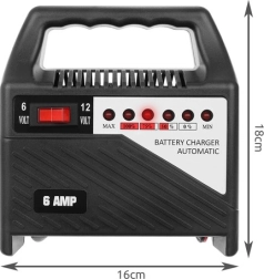 De praktische handgreep, compacte afmetingen en het lage gewicht maken opbergen en meenemen eenvoudig. Met de schakelaar kiest u de juiste spanning (6 V / 12 V) en robuuste klemmen zorgen voor een betrouwbare verbinding met de accupolen.