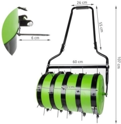 Houd uw gazon in topconditie met de praktische 2-in-1 wals en beluchter. Het robuuste frame en de duurzame materialen zorgen voor een lange levensduur, terwijl vijf verwisselbare spikemodules de bodem effectief doorboren tot een diepte van 4 cm voor een betere toevoer van lucht, water en voedingsstoffen. Na het vullen van de rol met water (tot 35 l) verdicht u de grond eenvoudig en drukt u het zaad aan voor een gelijkmatige groei.