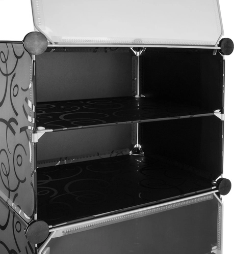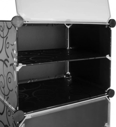 Duurzame kunststof panelen met decoratief patroon en metalen koppelingen zorgen voor stabiliteit en een lange levensduur, ook bij dagelijks gebruik. De montage is intuïtief, zonder speciaal gereedschap, en dankzij de compacte afmetingen bespaart de kast ruimte in hal, garderobe of slaapkamer.