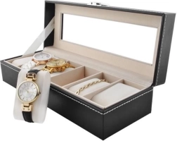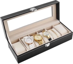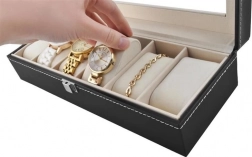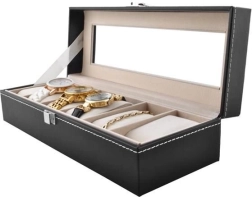 Wij presenteren u een elegante horloge-organizer met maar liefst 6 aparte vakken. Deze organizer is niet alleen bedoeld voor horloges, maar u kunt er ook veilig andere sieraden in opbergen dankzij het zachte materiaal aan de binnenkant, dat beschermt tegen krassen.