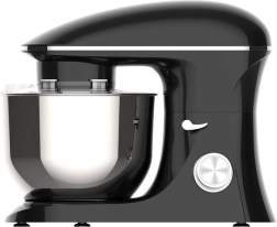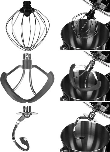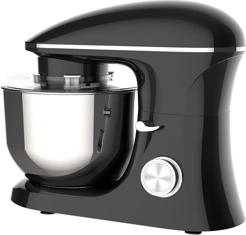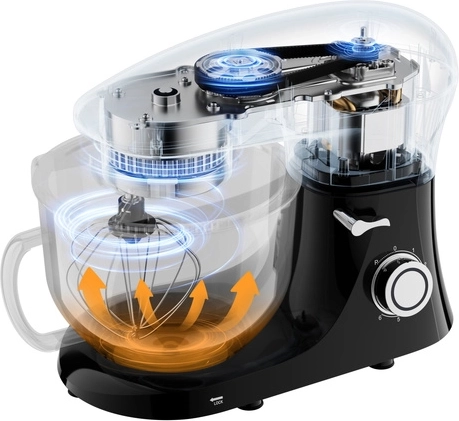 De machine heeft een grote roestvrijstalen kom met een inhoud van 6,2 liter, voorzien van een stevige handgreep en een spatscherm, wat het werk vergemakkelijkt en de keuken schoon houdt.