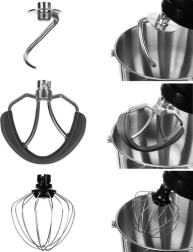 De robot wordt geleverd met drie verschillende opzetstukken: een garde, deeghaak en een mixer. Essentiële hulpmiddelen voor de perfecte voorbereiding van deeg, crèmes en al uw favoriete lekkernijen. Bovendien omvat het stijlvolle accessoires zoals een patisseriezak, spuitmondjes en een eischeider.