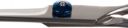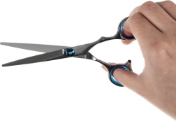 Blauwe vingerringen, vingersteunen en een soepel scharnier met blauwe schroef bieden comfort, stabiliteit en precisie, ook bij langer knippen.