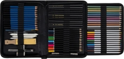 Deze universele set voor tekenen, schilderen en schetsen biedt een ruime keuze aan grafiet- en houtskoolpotloden, aquarel-, metallic en klassieke kleurpotloden, samen met praktische hulpmiddelen voor arcering en details. Het stevige textiletui houdt alle benodigdheden geordend en klaar voor gebruik, thuis en onderweg.