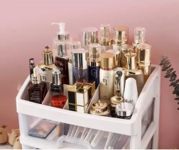 Het ingedeelde bovenste niveau biedt plaats aan flesjes, kwasten, pennen en kleine elektronica – alles heeft zijn eigen plek.