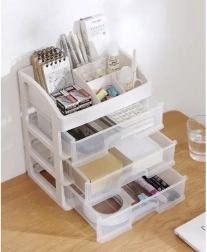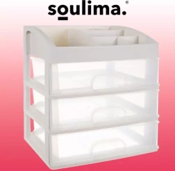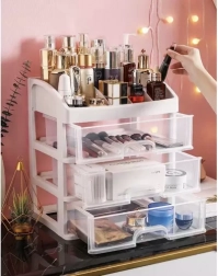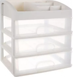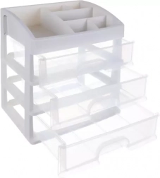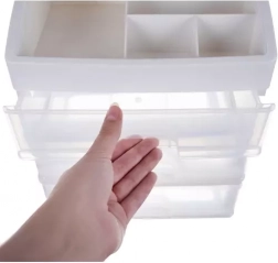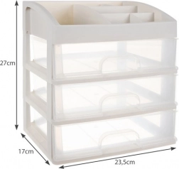 Deze veelzijdige organizer combineert overzichtelijke indeling met een compact ontwerp. Drie even grote transparante laden zijn ideaal voor paletten, kwasten, lipsticks of sieraden, terwijl het bovenste niveau met 6 verschillende vakken plaats biedt aan flesjes, crèmes en kleine accessoires. De melkwitte/transparante look past elegant in elk interieur.
