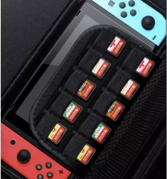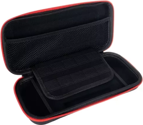 De doordachte interne indeling omvat een meshvak voor kabels of oordopjes en sleuven voor 10 cartridges, zodat je je gamebibliotheek altijd bij de hand hebt. Dankzij de compacte afmetingen en de praktische handlus is het de ideale keuze voor reizen en dagelijks gebruik.