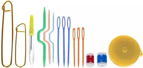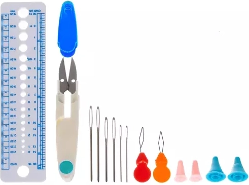 De set bevat niet alleen haaknaalden, maar ook een schaar, een liniaal en andere essentiële gereedschappen voor het haken.
