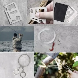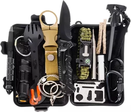 - opvouwbaar mes met zaagje en koordsnijder, tactische pen, 11-in-1 survivalkaart, vuursteen met magnesiumstaaf en schraper met liniaal en opener, zaklamp, reddingsdeken 130 × 210 cm, afsluitbare container, fleshouder voor aan riem, paracord armband (ca. 3,5 m koord) met kompas, fluitje en vuurstarter, 2 st. siliconen aas + vislijn + 2 haken, eettool (lepel/vork met opener + mesje), opvouwbaar fluitje, 2 st. aansteekkoorden, 2 st. karabiners, strijkzaag ca. 60 cm