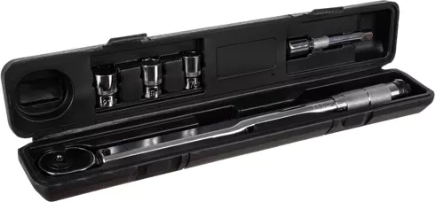 Robuuste momentsleutel 1/2" met ratel en een set doppen 17/19/21 mm en een verlengstuk voor nauwkeurig aandraaien en losdraaien van schroefverbindingen. Biedt een koppelbereik van 28–210 Nm, tweerichtingswerking rechts/links, vergrendeling LOCK/UNLOCK en een praktisch beschermetui voor veilige opslag. Ideaal voor zeskant- en vierkantschroeven, haken en motorfietsmutters.
