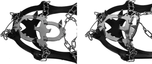 SPECIFICATIES - kleur: zwart/zilver; materiaal: TPE/roestvrij staal 304 en 430; aantal tanden per klauw: 12; maat: XL 44-47; dikte van het rubber dat de kettingen houdt: 0,4 cm; hoogte van de spike: 1,7 cm; afmetingen etui: 13/18/5 cm; gewicht: 434 g; gewicht met verpakking: 441 g.