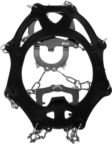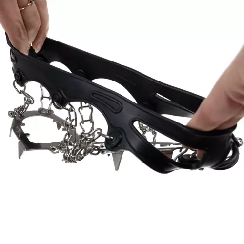 ROESTVASTE KETTINGEN EN VERSTERKTE HAKKAP– gemaakt van roestvrij staal. Bestand tegen roest en corrosie. Trek simpelweg de elastische kraag uit en plaats op de loopzool van de schoen. Onzegrijpersbeschadigen het schoeisel niet , omdat ze perfect aansluiten op de schoen, enversterkte hakpads zorgen voor stabiliteit, vooral bij afdalingen.