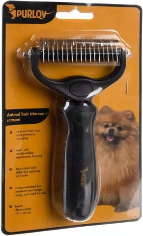Op zoek naar een effectieve oplossing tegen haren op kleding en meubels? De dubbelzijdige trimmer en vachthark PURLOV is ontworpen voor snel en zacht uitkammen van honden en katten. Twee tandafstanden (17 en 9) kunnen elk vachttype aan – van dichte ondervacht tot fijnere haren. De binnenranden zijn geslepen voor soepel doorsnijden van klitten, terwijl de afgeronde uiteinden de huid van je huisdier beschermen.