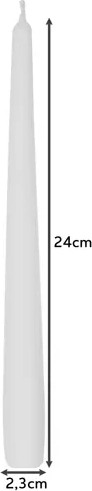 Creëer een aangename sfeer met witte kegelkaarsen die perfect passen bij feestelijke tafelschikkingen en interieurdecoratie. Dankzij de hoogte van 24,5 cm en de slanke diameter van 2,3 cm ogen ze elegant en passen ze in de meeste klassieke kandelaars.