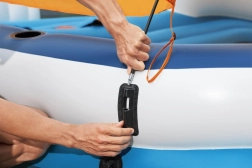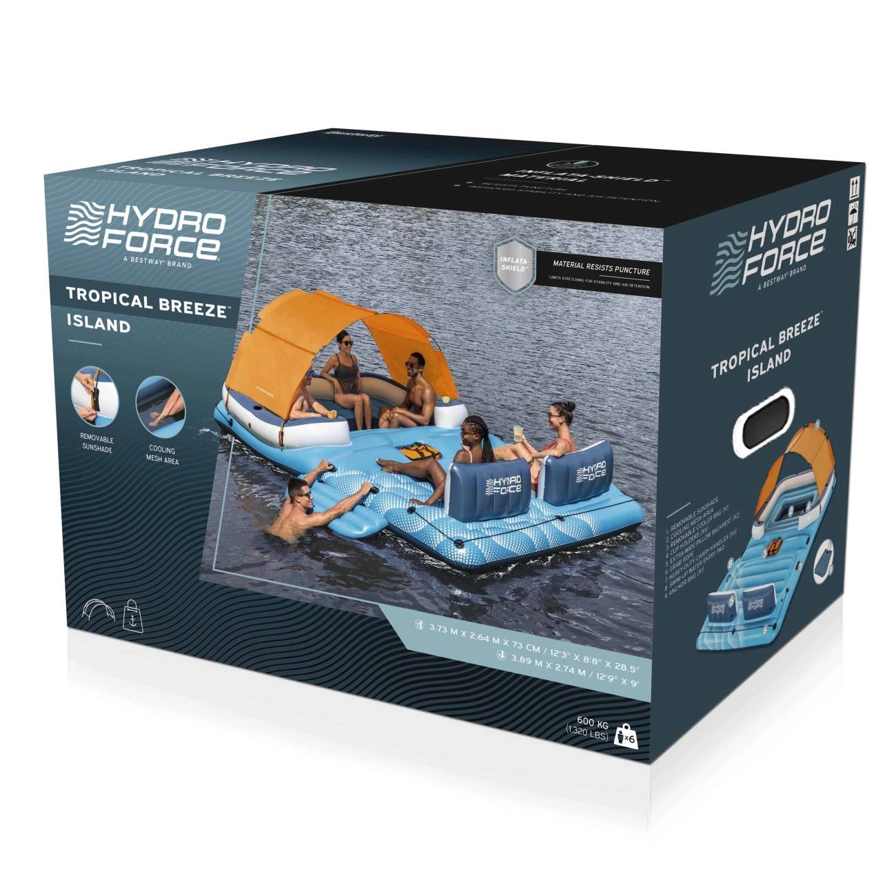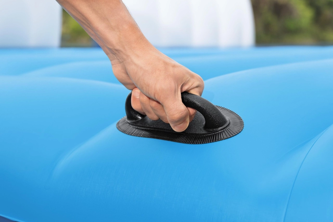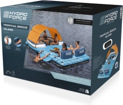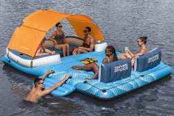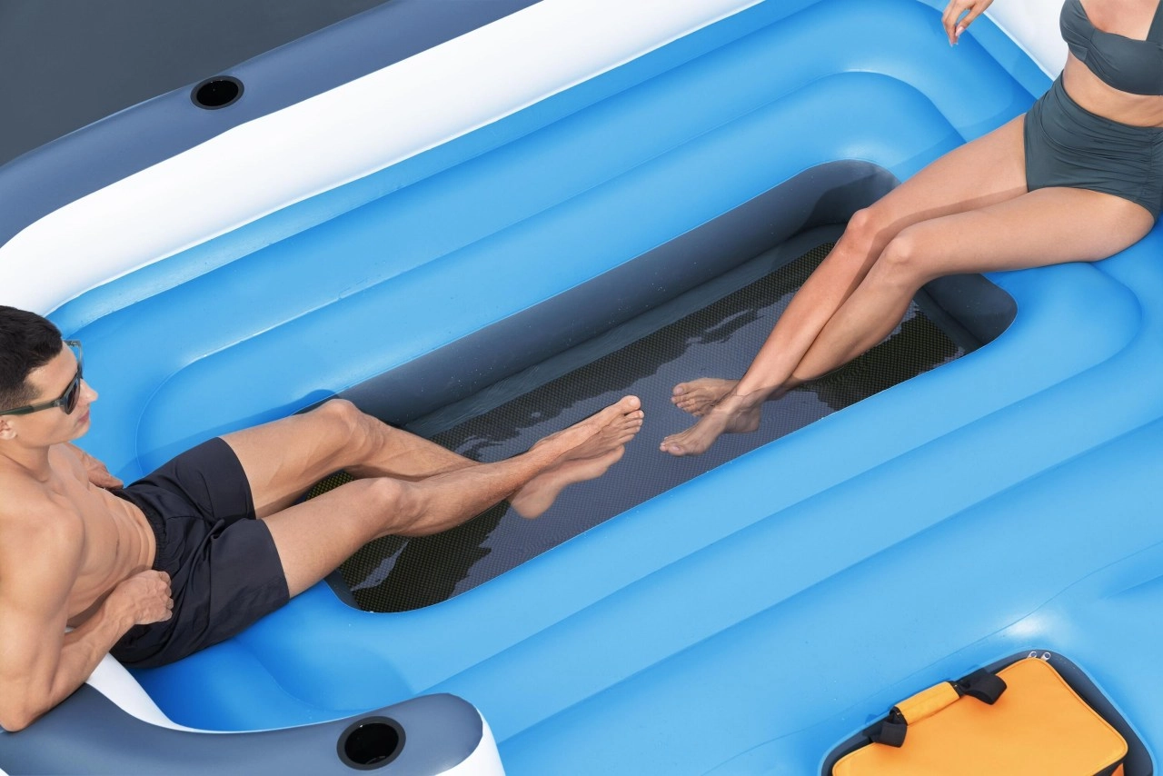 Matras voor zes personen met afmetingen van 389x274 cm en uitgerust met een kamersysteem dat de veerkracht verhoogt. Bij de set is ook een reparatiepleister inbegrepen voor extra zekerheid tijdens het gebruik. Het opblaasbare matras heeft in het midden een klein plonsbad voor verkoelende voeten en geïntegreerde handige handgrepen en lijnen voor eenvoudig hanteren en opstappen.