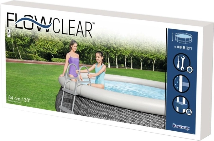 De BESTWAY Flowclear ladder voor zwembaden tot 84 cm hoogte is ontworpen voor maximale veiligheid en comfort. Het stabiele metalen frame met anticorrosiebehandeling en de stevige kunststof treden zorgen voor een zekere stap bij elke in- en uitstap. Ideale oplossing voor tuinzwembaden, kinderen en senioren.