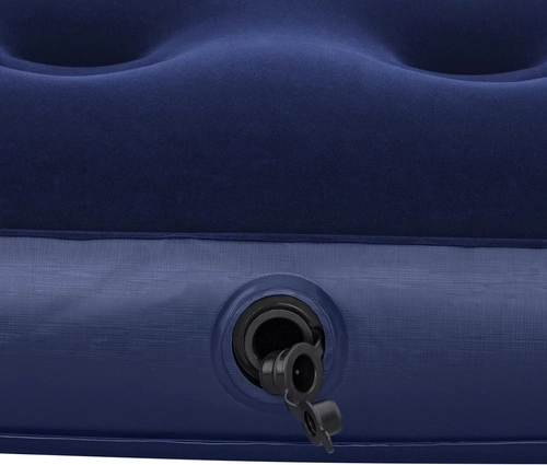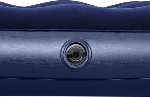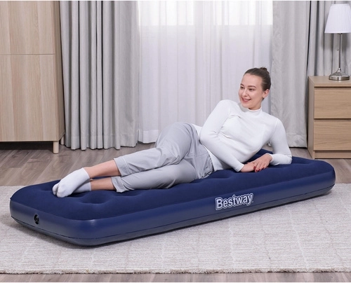 Praktisch opblaasbaar matras voor één persoon met afmetingen 185 × 76 × 22 cm van het merk BESTWAY, ideaal voor thuis en op reis. Het heeft een aangenaam velours oppervlak, een duurzame coil-beam constructie, een veiligheidsventiel voor eenvoudig opblazen en leeglaten, en in de verpakking vind je ook een zelfklevende reparatiepatch.