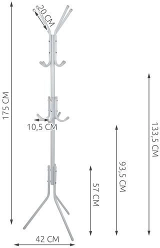 De staande kapstok is ontworpen om orde en overzicht in uw ruimte te houden. Hij is uitgerust met 12 haken met kunststof beschermkapjes die uw kleding beschermen. Ideaal voor het ophangen van jassen, hoeden en paraplu’s op 3 niveaus haken.