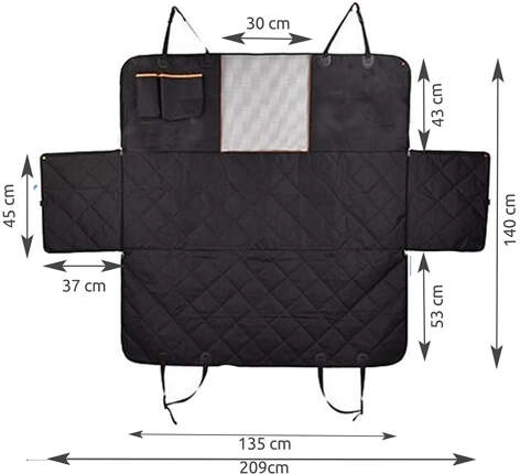 - Eenvoudige installatie en veiligheid voor je huisdier dankzij openingen voor veiligheidsgordels. De hoes wordt gemakkelijk over de achterbank uitgespreid en met riemen bevestigd.