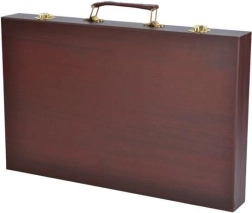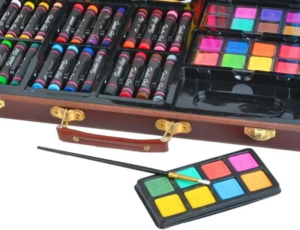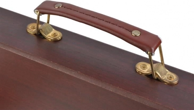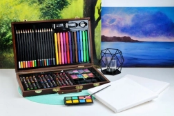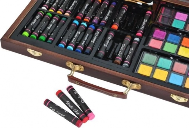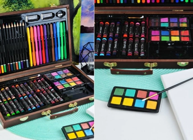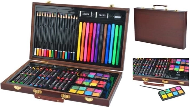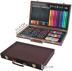 Deze veelzijdige kunstset biedt alles wat je nodig hebt om je creativiteit te ontwikkelen – van schetsen tot aquarelschilderen. Alles is opgeborgen in een duurzame houten koffer met veilige metalen sluitingen en een comfortabele lederen handgreep voor gemakkelijk dragen. Dankzij de afzonderlijke vakken heb je elk hulpmiddel direct bij de hand en blijft alles perfect geordend.
