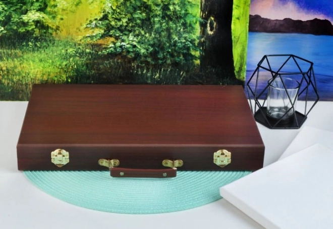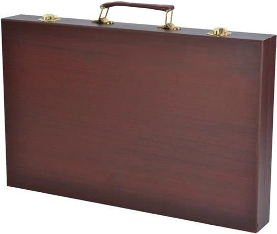 Alle kunstbenodigdheden zijn netjes geordend in een uitklapbare houten koffer met vakken, zodat je altijd snel en gemakkelijk toegang hebt tot alles wat je nodig hebt.