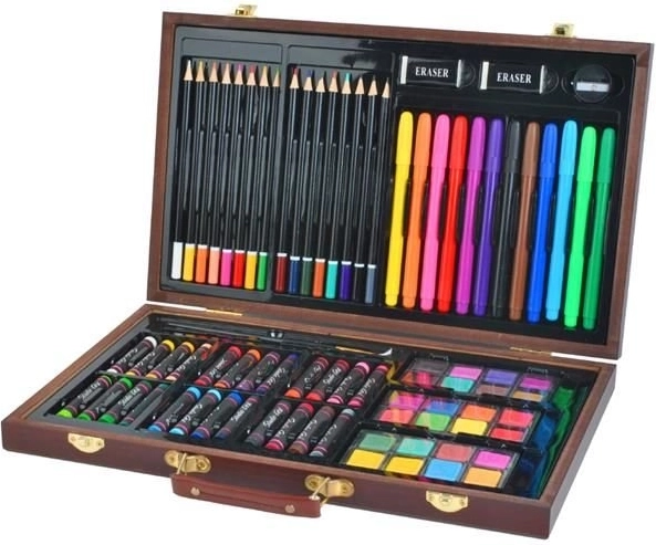 De set bevat 24 oliepastels, 16 kleurpotloden, 24 aquarelkleuren, 12 stiften, 2 penselen, een puntenslijper, 2 gummen, een tekenblok en een kleurboek – geweldig voor kinderen vanaf 3 jaar en volwassenen. Materialen van hoge kwaliteit en een rijk kleurenpalet maken het mogelijk om originele en creatieve werken te maken, thuis, op school en in de buitenlucht.