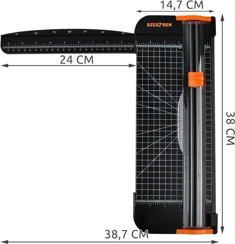 Een geïntegreerde centimeter- en inchschaal, raster en transparante geleider maken het mogelijk papier tot op de millimeter nauwkeurig te positioneren en zowel recht als onder een hoek te snijden.