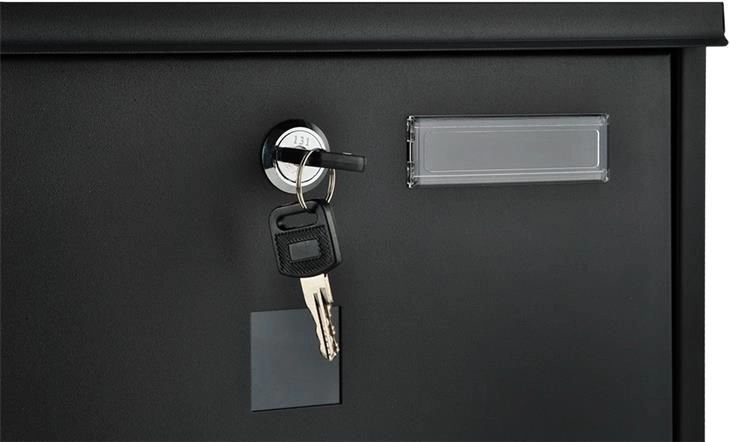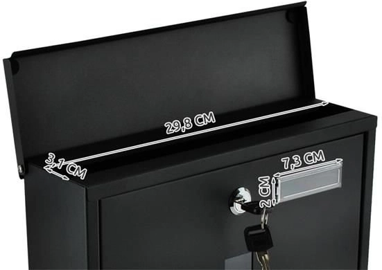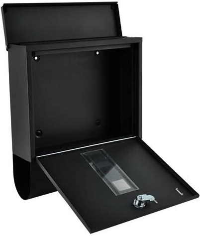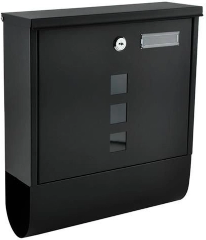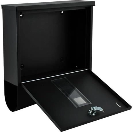 Elegante zwarte brievenbus van duurzaam, galvanisch verzinkt metaal voor veilige bezorging van uw post. Heeft een afgedekte inwerpgleuf voor formaat A4, een afsluitbaar deurtje met 2 sleutels en een praktische houder voor kranten en folders. De robuuste constructie met weersbestendige bescherming en ventilatieopeningen houdt zendingen droog; montage is eenvoudig dankzij de meegeleverde accessoires.