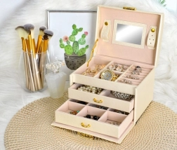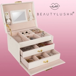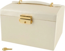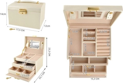 In het deksel vind je een praktisch spiegeltje en bandjes met sluiting voor het veilig vastzetten van sieraden zonder in de knoop te raken. De robuuste constructie en hoogwaardige afwerking met gouden accenten geven de sieradendoos een luxueuze uitstraling, terwijl het slot met sleutel privacy en veiligheid voor je kostbaarheden biedt.