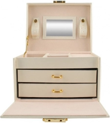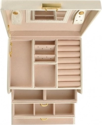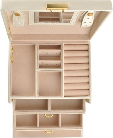 Verschillende formaten compartimenten, ringenrollen en twee lades houden alles op zijn plek – van oorbellen tot horloges.
