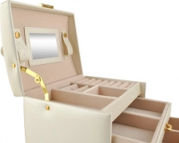 Spiegeltje in het deksel voor snelle touch-ups en bandjes met sluiting voor het veilig vastzetten van kettingen en armbanden.