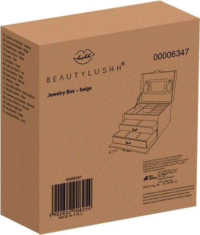 Elegante sieradendoos in beige met satijnen afwerking, met tot 20 vakken, 2 lades en praktische ringenrollen. In de binnenkant van het deksel zit een spiegeltje en bandjes met sluiting voor kettingen of armbanden. Dankzij het slot met sleutel zijn je sieraden veilig, terwijl de zachte bekleding beschermt tegen krassen. Gouden details benadrukken de tijdloze elegantie en de sieradendoos is perfect voor thuis én onderweg.