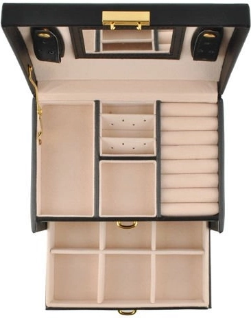 De binnenvoering van zacht materiaal is vriendelijk voor sieradenoppervlakken zodat ze niet krassen. Dankzij het praktische handvat is de sieradendoos gemakkelijk mee te nemen en door de compacte afmetingen past hij op de kaptafel of in een lade. De tijdloze zwarte kleur en gouden accenten benadrukken het elegante karakter van het interieur.