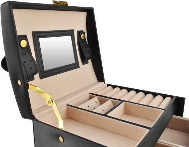 Zwart PU‑leer met gouden accenten en een praktische spiegel in het deksel combineren stijl en functionaliteit bij de dagelijkse sieradenverzorging.