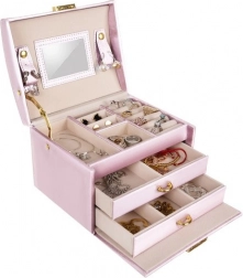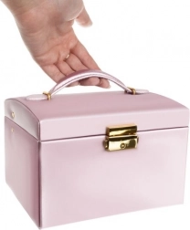 Compartimenten in verschillende grootte, rollen en bandjes met drukkers houden ringen, oorbellen, kettingen en horloges overzichtelijk en zonder in de knoop te raken.