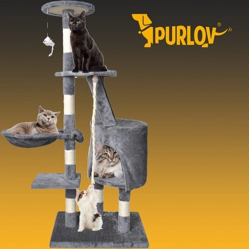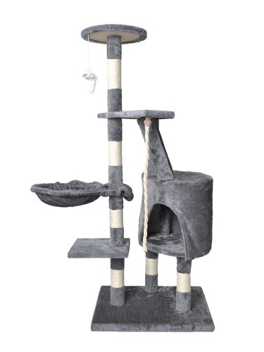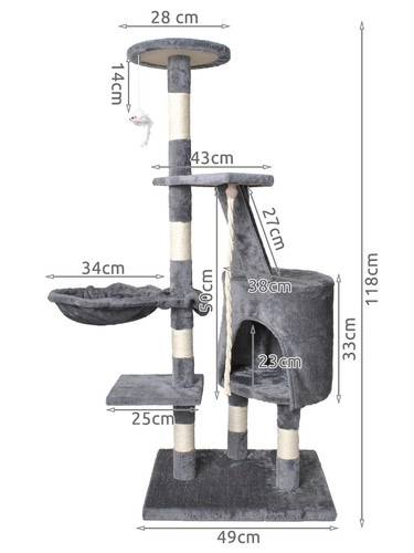 Biedt meerdere niveaus voor katten, waaronder een knus huisje, trapjes en een hangend speeltje dat de nieuwsgierigheid van katten prikkelt.