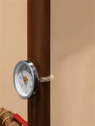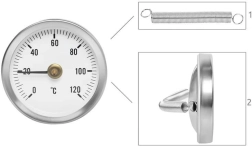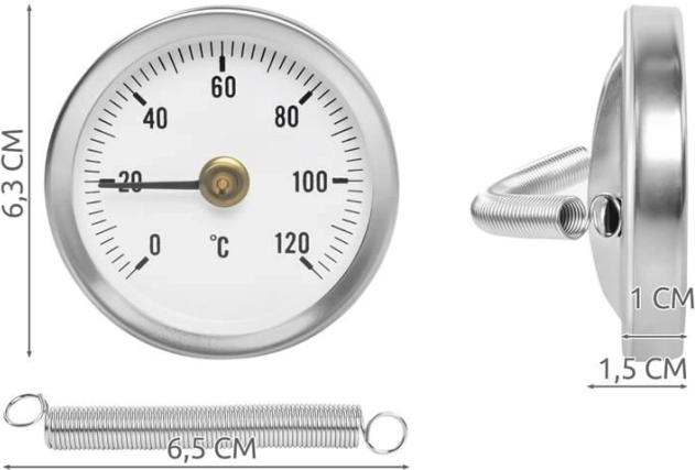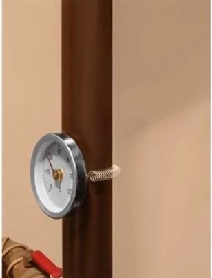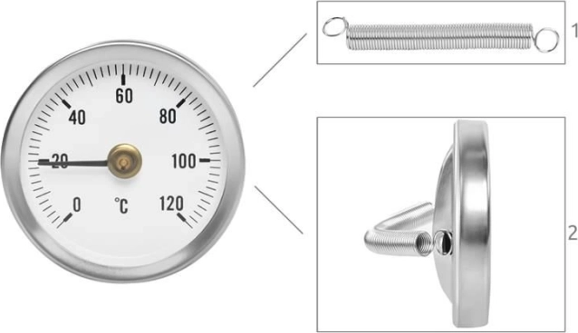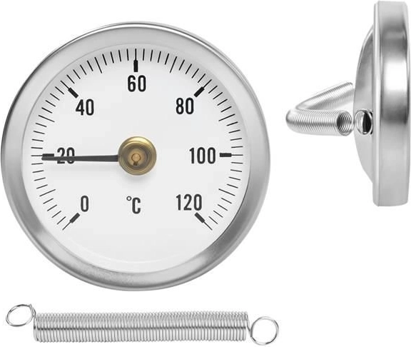 De montage is eenvoudig met de meegeleverde veer, die zich aanpast aan standaardafmetingen van leidingen. De bimetaalconstructie maakt gebruik van het verschillende uitzettingsgedrag van metalen om de aanwijzer te verplaatsen, wat nauwkeurige en stabiele resultaten garandeert.