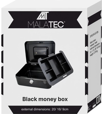 Het praktische metalen geldkistje van ISO TRADE in een elegante zwarte kleur bergt contant geld en kleine waardevolle spullen veilig op. Het biedt een slot met sleutel, een uitneembaar muntenbakje met verborgen ruimte eronder en een robuuste metalen constructie met een comfortabele inklapbare greep. De compacte afmetingen van 20 × 16 × 9 cm zijn geschikt voor thuis, kantoor en hotelkamer.