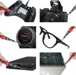 De brede selectie bits en accessoires dekt service aan smartphones, tablets, laptops, camera’s, gamecontrollers, maar ook werkzaamheden in horlogemakerij en optiek. De ergonomische handgreep met antisliprubber en de flexibele verlenging vergemakkelijken werken in krappe ruimtes.