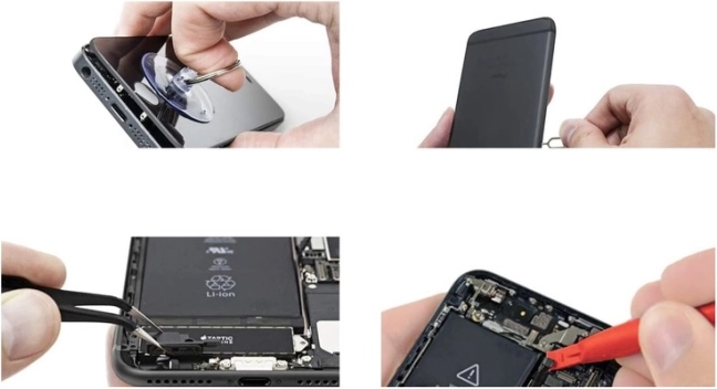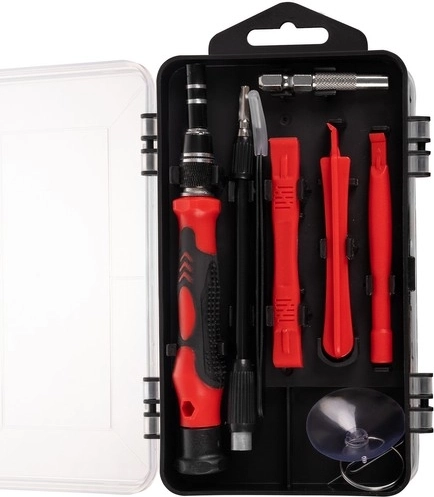 Magnetiseerder/demagnetiseerder, pincet met fijne punt en zuignap voor glas maken veilig demonteren van gevoelige apparaten mogelijk zonder beschadiging.