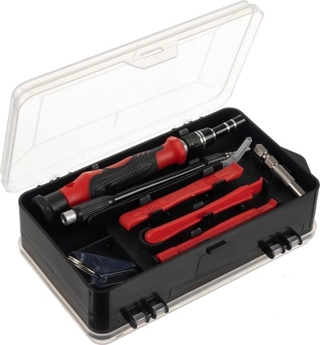 Deze professionele én hobby precisiegereedschapsset is ontworpen voor snel en veilig demonteren en monteren van apparaten met kleine en niet-standaard schroeven. Elk onderdeel heeft zijn plek in het compacte, aan beide zijden te openen etui, wat zorgt voor orde, overzicht en gemakkelijke draagbaarheid. Dankzij de magnetiseerder haalt u schroefjes comfortabel uit moeilijk bereikbare plekken.