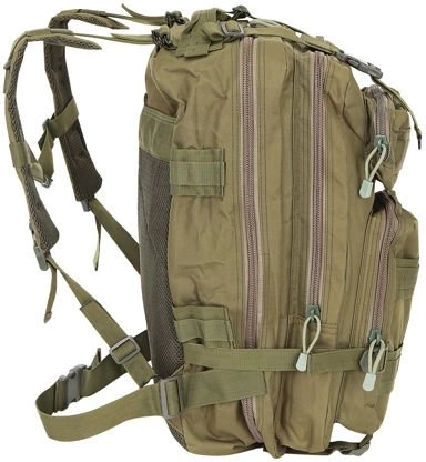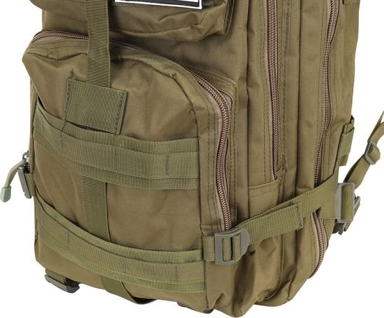 De rugzak is uitgerust met PALS-banden voor het MOLLE-systeem om extra uitrusting te bevestigen. Volledige verstelling maakt het mogelijk de omvang van de rugzak aan te passen met verstelbare banden, geschikt voor het dragen van bijvoorbeeld een slaapmat of tent.