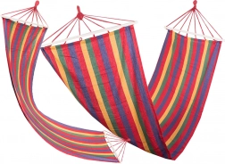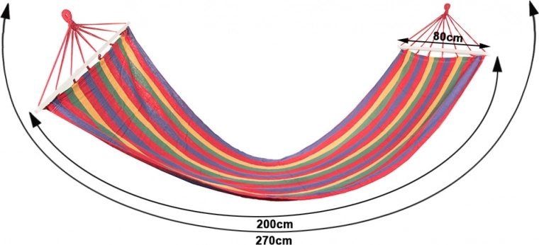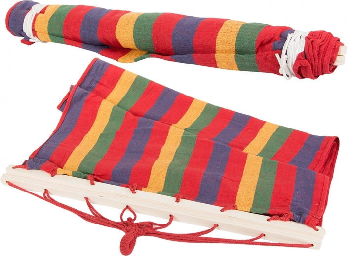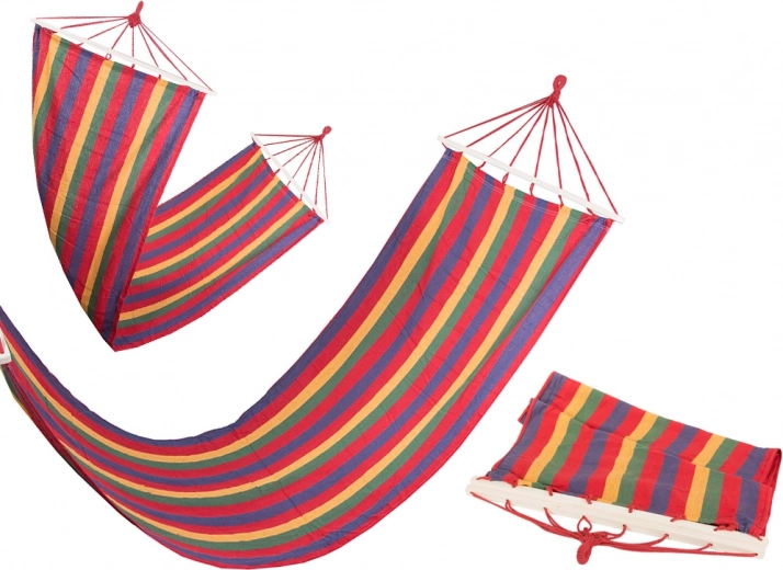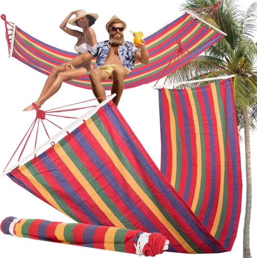 Geniet van ontspanning in de buitenlucht met deze gestreepte hangmat met houten spreidstokken. Biedt een ruim ligvlak van 200 × 80 cm, stabiele ligging dankzij de spreidstokken en een draagvermogen tot 150 kg. De duurzame mix van katoen en polyester is ademend, prettig aan de huid en gemakkelijk te onderhouden. Snelle montage, laag gewicht en een stijlvol, meerkleurig design maken het een ideale keuze voor tuin, terras, balkon en camping.