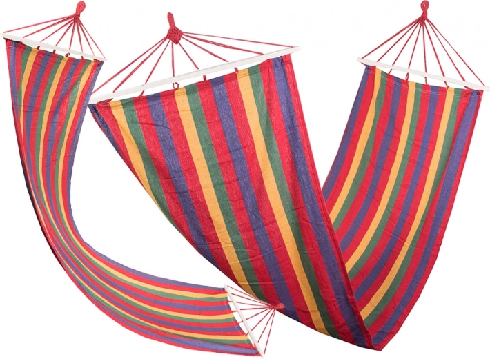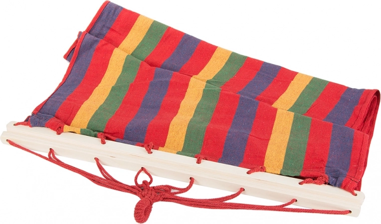 Deze comfortabele hangmat met houten spreidstokken houdt het ligvlak altijd open, waardoor in- en uitstappen eenvoudig is. De sterke stof van dik katoen met polyester is duurzaam, ademend en aangenaam voor dagelijks relaxen. Dankzij het draagvermogen van 150 kg biedt hij zekerheid en stabiliteit, zowel buiten als binnen.
