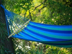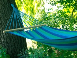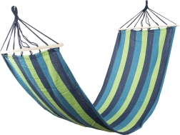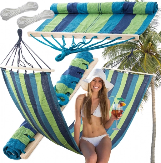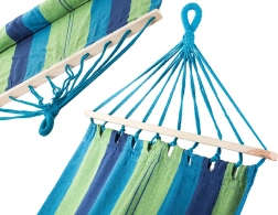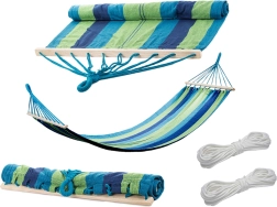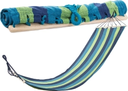 Deze tuin-hangmat met houten spreidstokken is ideaal voor ontspanning buiten en binnen. De duurzame mix van katoen en polyester is aangenaam om aan te raken, luchtig en toch sterk. Dankzij de stevige gevlochten touwen en de stabiele constructie geniet je van veilig en comfortabel schommelen.